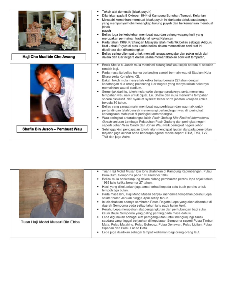 Ayah chik zainal Besut Terengganu Ayah chik zainal merupakan salah seorang penggiat seni ukiran kayuBeliau berkebolehan menghasilkan ukiran-ukiran kayusenjata-senjata melayu seperti keris dan lain-lainBeliau juga amat berkebolehan menghasilkan karya-karya lukisan pemandangan tradisional. Dalam bidang kraf terdapat beberapa orang adiguru yang terkenal antaranya ialah tokoh-tokoh seperti yang berikut. Tingkatan 3 71 matlamat dan bentuk penentangan masyarakat tempatan sebab penentangan tokoh tempatan abad ke 20 padankan oleh g66338845 tokoh kraf seni ragam hias perkataan yang hilang.