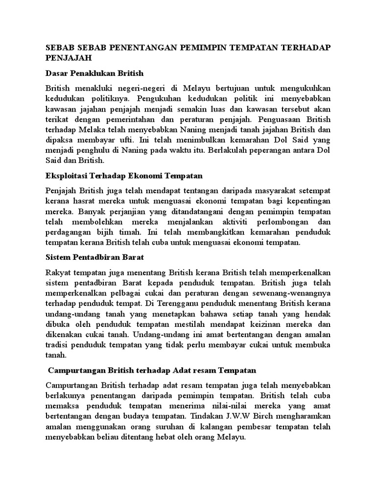 Sebab Sebab Penentangan Pemimpin Tempatan Terhadap Penjajah