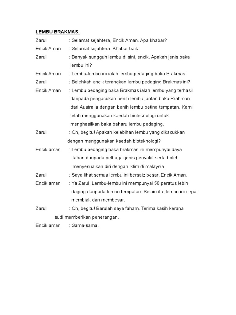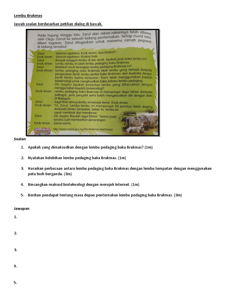 Huraikan perbezaan antara lembu pedaging baka brakmas dengan lembu tempatan. Nama _ Lembu Brakmas Pada hujung minggu lalu Zarul dan rakan-rakannya telah dibawa oleh Cikgu Zainal ke sebuah ladang. Tidak ketinggalan baka lembu tenusu yang juga menjadi penyumbang. 15072016 Encik Hazali.