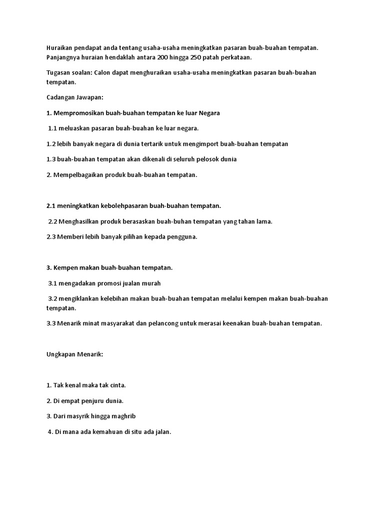 Buah-buahan tempatan juga telah pun berjaya dieksport ke luar negara. Huraikan pendapat anda tentang usaha-usaha meningkatkan pasaran buah-buahan tempatan. Potensi pasaran dan aspek aspek pemasaran.