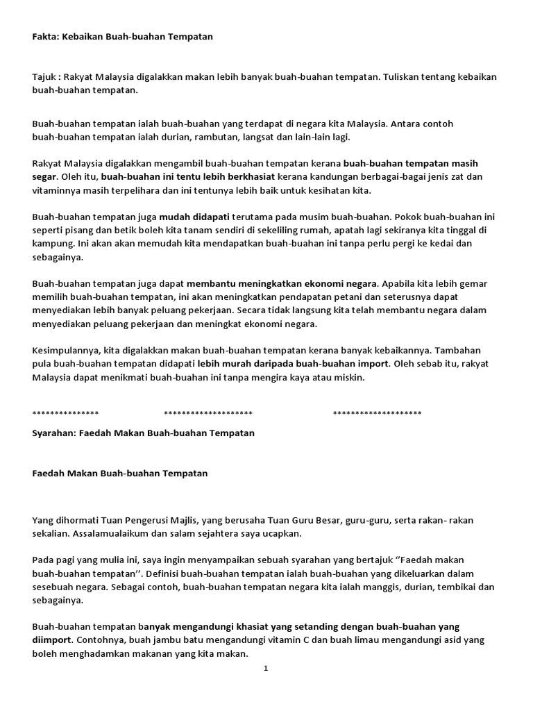 Antara kebaikan buah-buahan tempatan ialah buah-buahan tempatan lebih berkhasiat dan segar. Karangan pt3 buah buahan tempatan mampu bersaing dengan buah buahan yang diimport anda akan mewakili sekolah ke pertandingan perbahasan peringkat negeri tajuk perbahasan ialah buah buahan tempatan mampu bersaing dengan buah buahan yang diimport selaku pihak pencadang sediakan hujah hujah anda.
