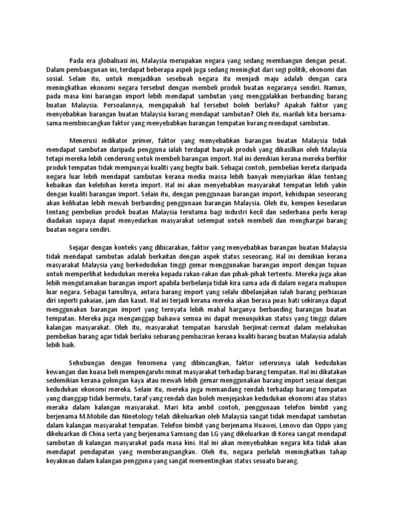 Barangan import vs barangan tempatan. Sebagai contoh kereta-kereta nasional yang berkualitiseperti Myvi Viva kini Inspira. Bahasa Malaysia PBSMR Kerangka Karangan Penulisan PBSMR Penulisan PT3 Penulisan SPM Apa khabar semua. 09022012 Sesungguhnya barangan tempatan lebih murah malah kualitinyajuga setanding dengan barangan import.