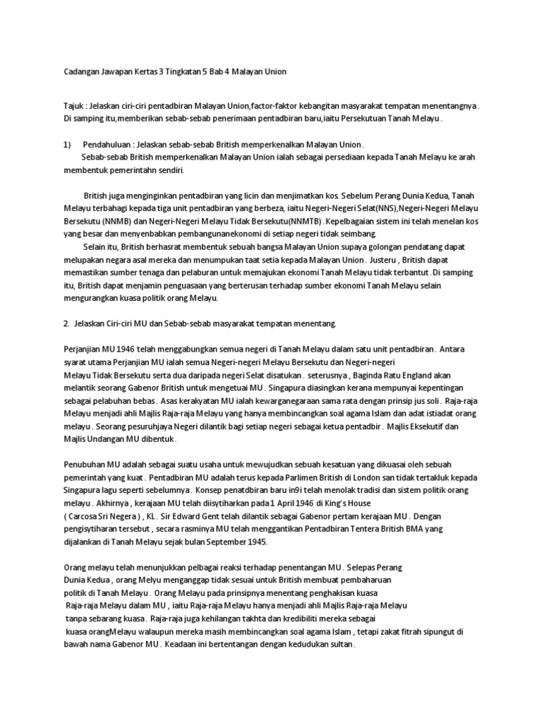 Cadangan Jawapan Kertas 3 Tingkatan 5 Bab 4 Malayan Union Docx